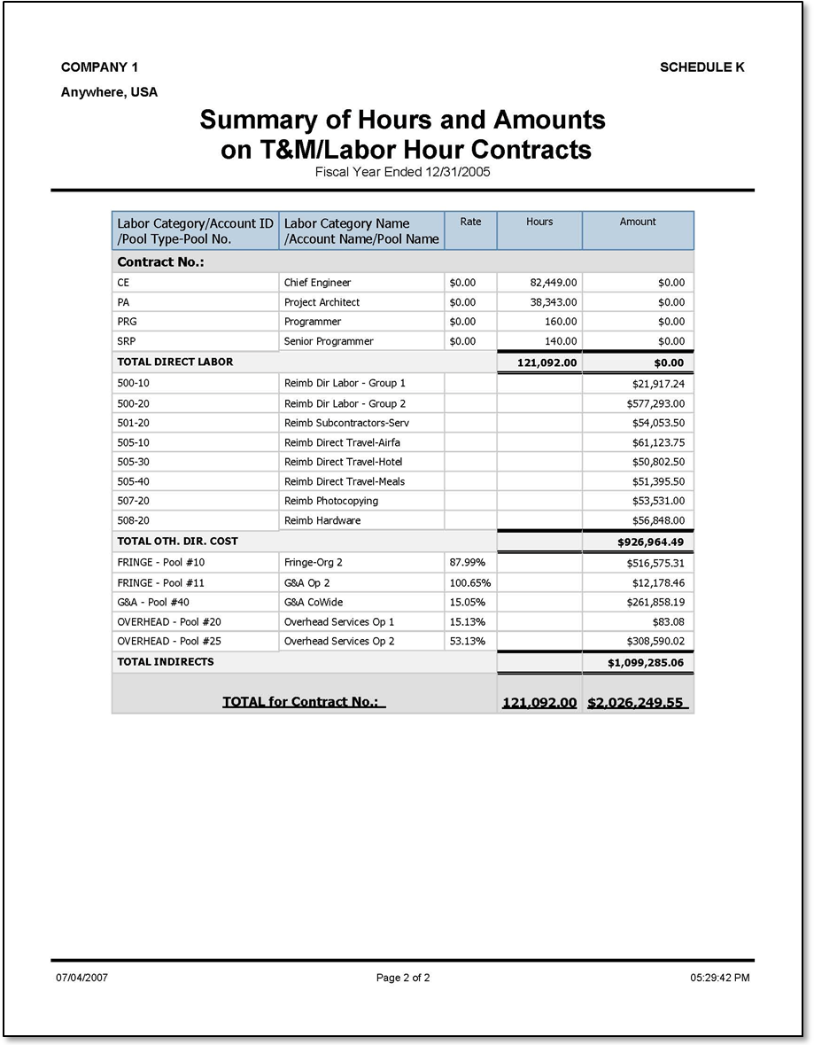 Sample Summary of Hours and Amounts on T&M/Labor Hour Contracts report.