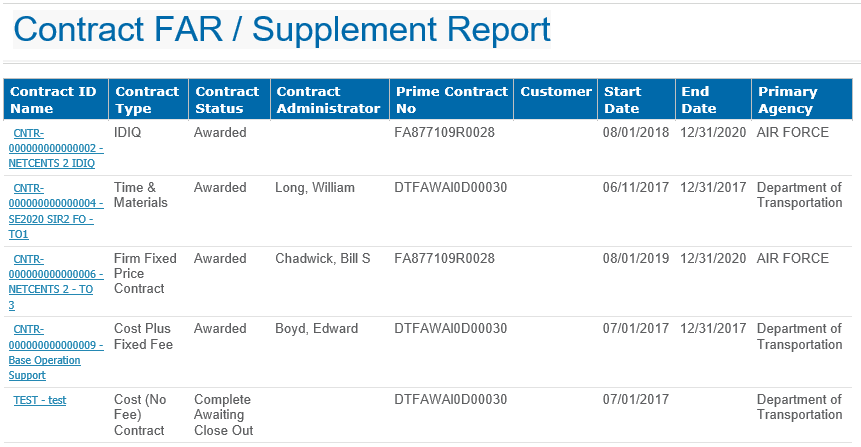 This is a sample Contract FAR/Supplement report.