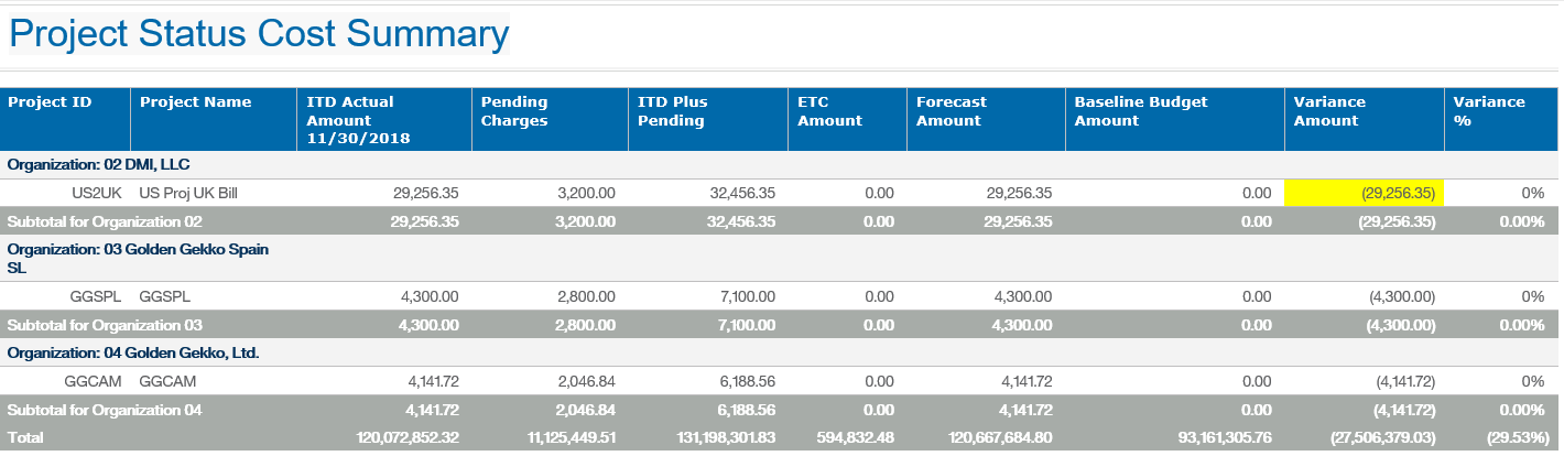 Parent Topic: Project Status Cost Summary