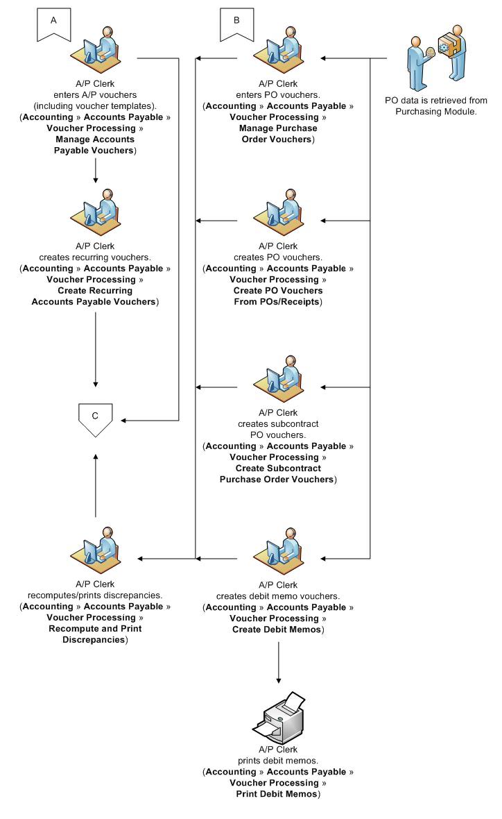 This section describes the Accounts Payable task flow from the entry of accounts payable or purchase order vouchers up to the printing of discrepancies and debit memos.