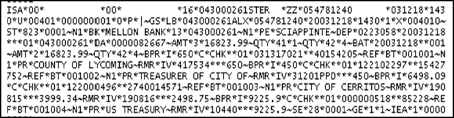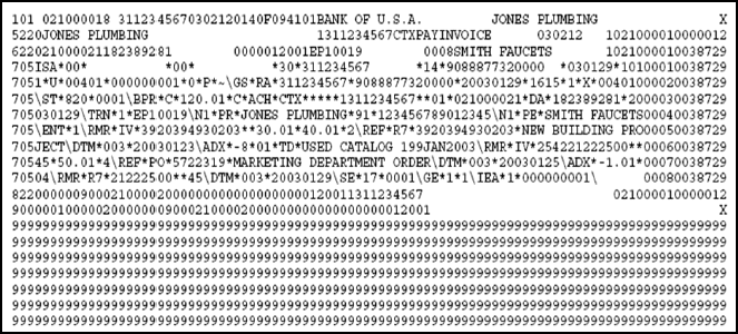 The following illustration provides an example of a NACHA-formatted input file that contains an 820 transaction set, after the ST segment.