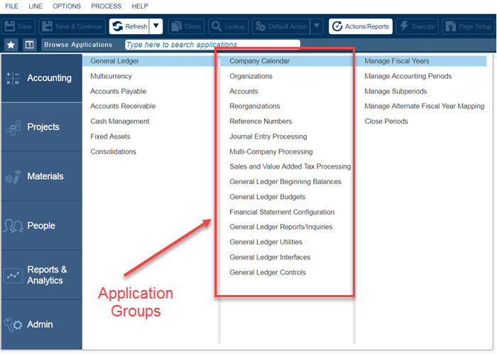 In the example above, when the Company Calendar group is selected, applications that belong to that group (for example, Manage Fiscal Years, Manage Accounting Periods, Manage Subperiods, Manage Alternate Fiscal Year Mapping, and Close Periods) display on the right-hand pane.