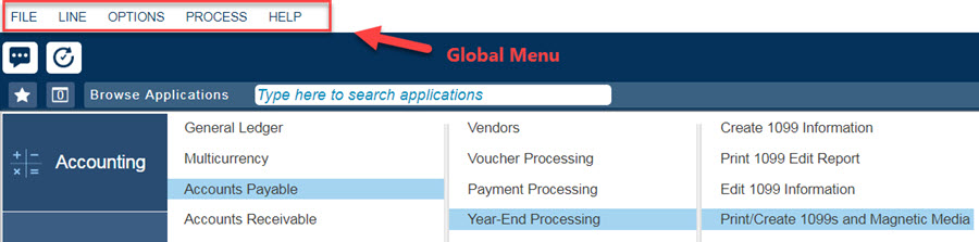 - OPTIONS: Contains options to select company data, search for data and records, navigate through records, and modify user preferences.