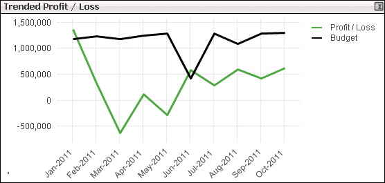 The Trended Profit / Loss line chart shows how profit in the general ledger has changed over time for the current fiscal year. You can view trending for period-by-period profit or for year-to-date profit.