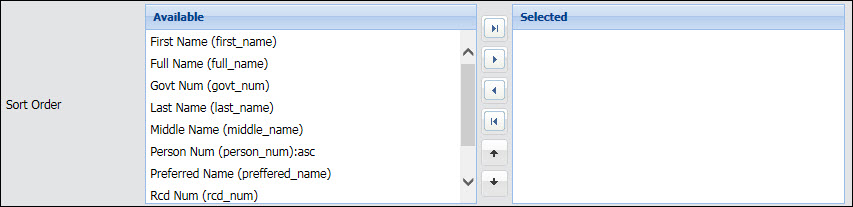 The Sort Order section determines how records will be sorted when the form is first displayed to the user (i.e., the default sort). The Selected fields are the fields by which the records will be sorted. If any records are duplicates, they will be sorted by the second field listed in the Selected box. Use the up and down arrow buttons change the order of the sort fields.