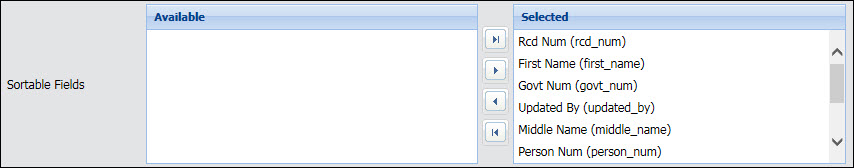 The Sortable Fields section is used to configure which fields on the form may be sorted. If the user clicks a column that contains a sortable field, the records will sort based on the information in that column (in ascending or descending order).