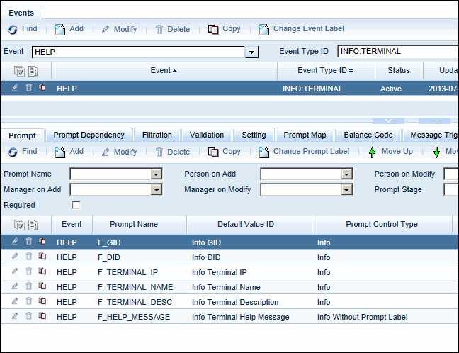 The system-defined HELP event has six prompts that display information about the terminal, such as the GID, DID, Terminal Name, and so on. These prompts have a Prompt Control Type of Info or Info Without Prompt Label. The prompts do not allow user input, but instead display information.