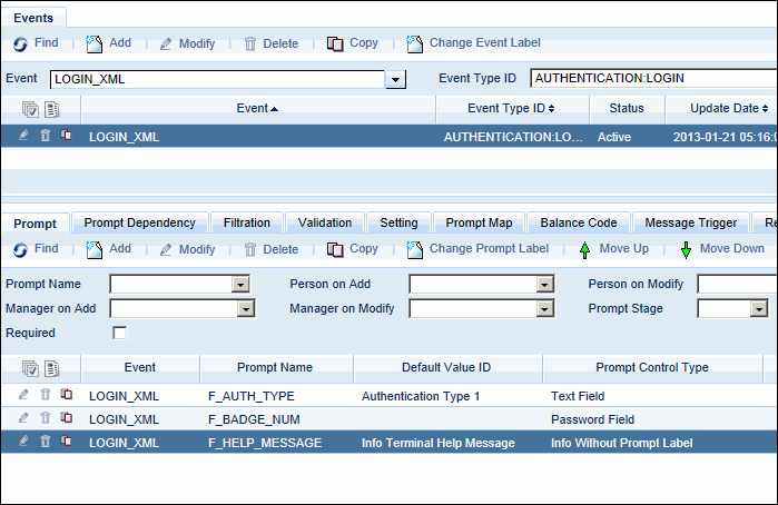 On the Events form, you must add the F_HELP_MESSAGE prompt to this AUTHENTICATION:LOGIN event. Set the Prompt Control Type to Info Without Prompt Label. For the Default Value ID, select the Default Value that corresponds to the help message you want to display (for example, Info Terminal Help Message).