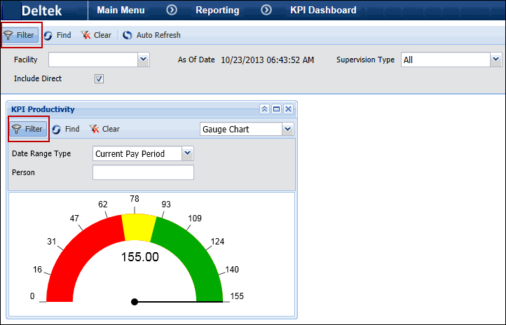 Use the filter fields at the top of the dashboard (Facility, Supervision Type, and Include Direct) to select a group of employees for whom the KPI data will be calculated. The maximum number of employees for which the data can be displayed is controlled by the max_supervisor_records Application setting.
