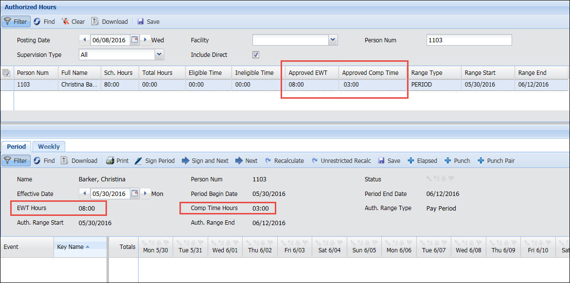 These hours will display in the EWT Hours and Comp Time Hours fields on the Period and Weekly tabs at the bottom of the Authorized Hours form.