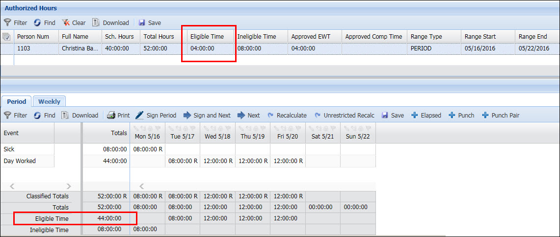 The Authorized Hours form shows an employee’s scheduled hours, total hours worked, and the number of hours that are eligible or ineligible for EWT and Comp Time. It also shows the Period and Weekly timecard tabs for the employee.