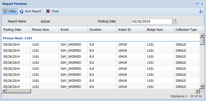 If you want to group the data in the report, select a Grouping Column. For example, if you want your Action report to group the data for each employee, select Person Num as your Grouping Column. You must also check the Grouping box and specify a Grouping Order for the column (Ascending or Descending).