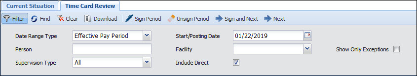 Click the Filter button at the top of the Time Card Review form to display the filter fields. Use these fields to change the employees that display on the form. Click Find after you define your filter settings. Click Clear to remove all the filter settings.