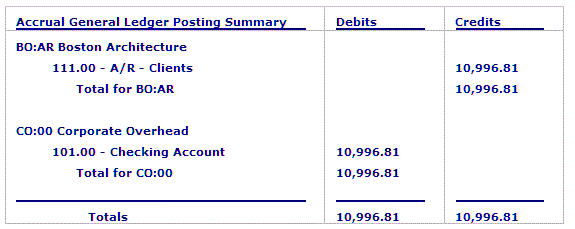 Assume that you post a cash receipt file with payments totaling $10,996.81. On the accrual side, this transaction posts as a credit to account 111.00, AR - Clients. For cash-basis reporting purposes, you set up revenue account 401.00, Billed Fee Revenue, and mapped this account to account 111.00.