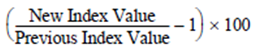 In this formula, the index values depend on whether this is the initial iteration of the calculation. If it is, the New Index Value is the index value that was valid on the date that you entered in the Index Date, Initial Adjustment field on the subscription line, and the Previous Index Value is the index value that was valid on the date that you entered in the Index Date, Base field. If it is not the first iteration, the New Index Value is the index value that was valid 1, 2, 3, and so on, years after the date in the Index Date, Initial Adjustment field, depending on the iteration. This means that in the second iteration, the New Index Value is the index value that was valid one year after the initial index date, and in each subsequent iteration, the Maconomy increases the date by one year. In addition, if it is not the first iteration, the Previous Index Value is the New Index Value that was used in the previous iteration.