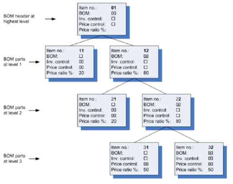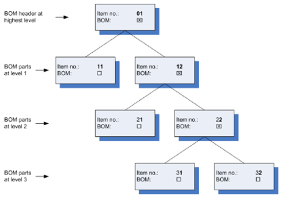 The level concept that this manual uses works as follows: The highest level of a BOM (level 0) is the BOM header. The BOM item parts at level 1 are the items and BOM headers that are attached in the sub-tab to the BOM header in the tab. The BOM item parts at level 2 are the items and BOMs that are attached to the BOM header at level 1. The BOM items parts at level 3 are the items and BOMs attached to the BOM at level 2, and so on. You see all of the levels of a BOM in one workspace.