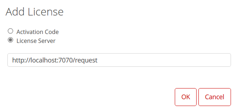 4. Select License Server, enter either the cloud license server URL (provided by your company) or the local license server URL (http://<license_server_host>:7070/request), and click OK.