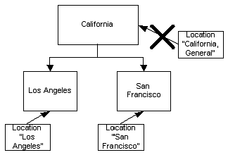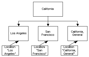 Furthermore, it is not possible for a node to be both a leaf and a parent. Returning to our basic example, consider a situation where you register certain expenses that concern the whole California division (for instance rent of facilities) on a location called “California, General.” You do not wish to register parts of the expense on each California office, as it concerns the division as a whole. In a situation like this, you cannot assign the location “California, General” directly to the node “California” as if the node were a leaf, as it already has the children “Los Angeles” and “San Francisco.” Instead, you must create a node for the general location value, making it a child of the “California” node and assigning the “California, General” location. By means of this structure, the total of the California division will include figures from the individual offices as well as the general entries, and the location “California, General” will appear as a separate item beneath the California node, just like the individual offices.