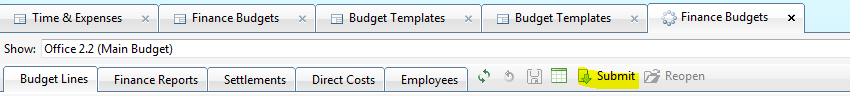 Budget Submission When the budget is ready, submit it for approval by clicking Submit in the Budget Lines tab. Parent Topic: Interface Overview HomeFinanceGeneral Ledger ConceptsFinancial BudgetingInterface OverviewBudget Submission