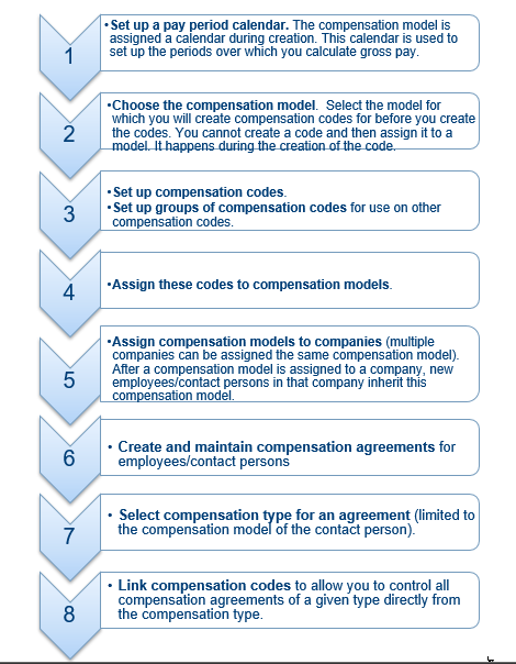 Compensation Code Setup This workflow describes how to set up a compensation code. Parent Topic: Workflow HomeFinanceGeneral Ledger ConceptsAdvanced CostingWorkflowCompensation Code Setup