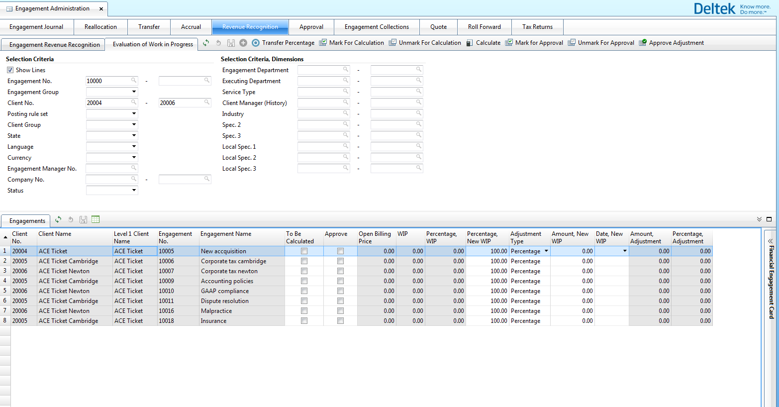 - Revenue Recognition (WIP Evaluation): The revenue recognition engine in Maconomy offers a number of methods; however, the method that is most commonly used by CPA firms is the Evaluation of WIP feature. You can evaluate WIP at the client/engagement/task level or book a top-line WIP evaluation at the G/L level.