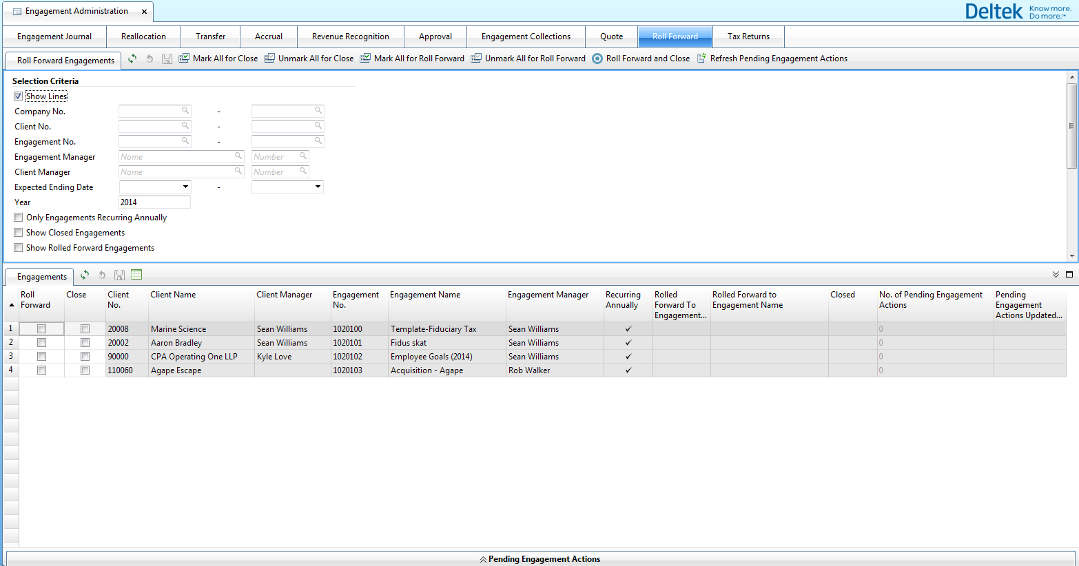- Roll Forward: The CPA solution offers a roll-forward feature that is commonly used by CPA firms to roll forward engagements from one year to the next. The solution automatically updates the engagement year (for example, from 2013 to 2014) and copies the critical engagement information to the new engagement.