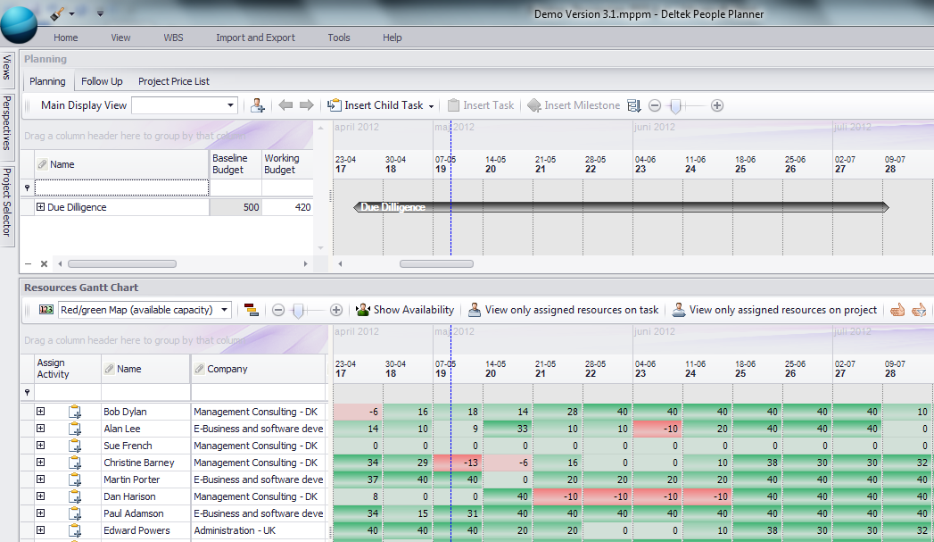 Most companies use a very simple approach to project staffing to ensure that all plans are always fully updated, although the People Planner software supports planning on all levels of the WBS. This means that project staffing is performed at the project level. In the following figure, you can see the Project Planning tab in the top of the window. The project plan is synchronized with the Resource Gantt Chart at the bottom, where you can search for available resources while you create the project plan.