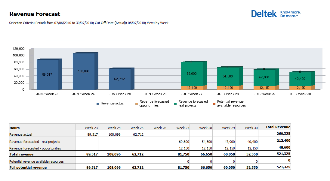 - Project Forecast (Multiple Projects): Shows actual hours divided by week or month to compare with planned hours. This shows you the total number of planned hours for a range of projects.