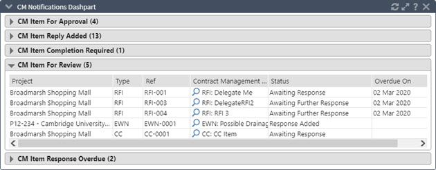 You can view all your contract items, grouped by status, via the CM Notifications dashpart in the Personal Zone. This includes items that require your response, and items that you are assigned to for information only.
