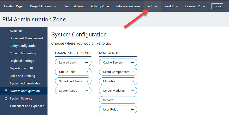 All system administrative features are available in the PIM Administration Zone. To access the Administration Zone, click Admin on the header bar.