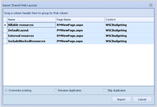 If you choose an existing Shared Web Layout, use the radio buttons to indicate how you want the import to be performed:
