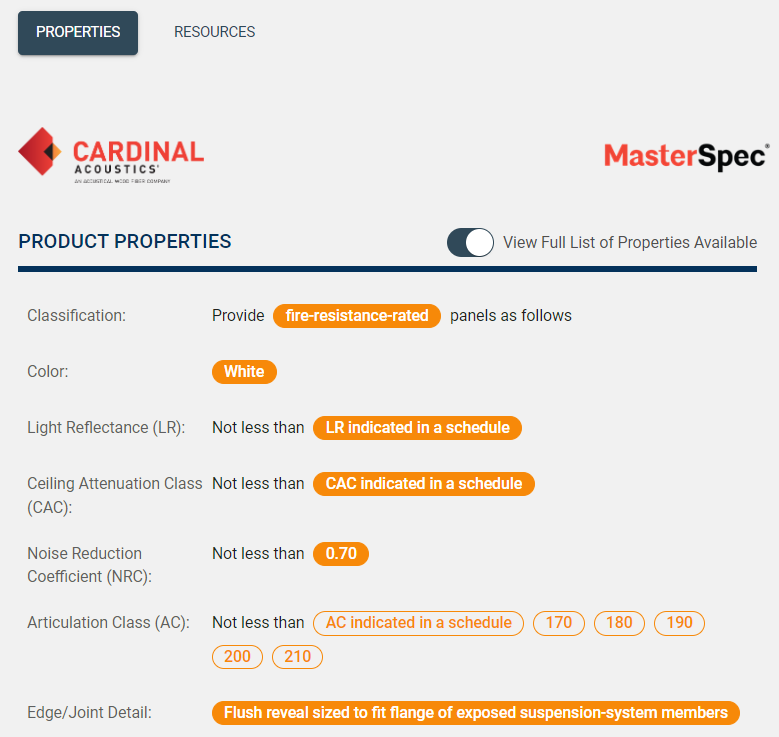 Use the contents of this tab to view product properties for a product listing to determine whether a product fits your project requirements.