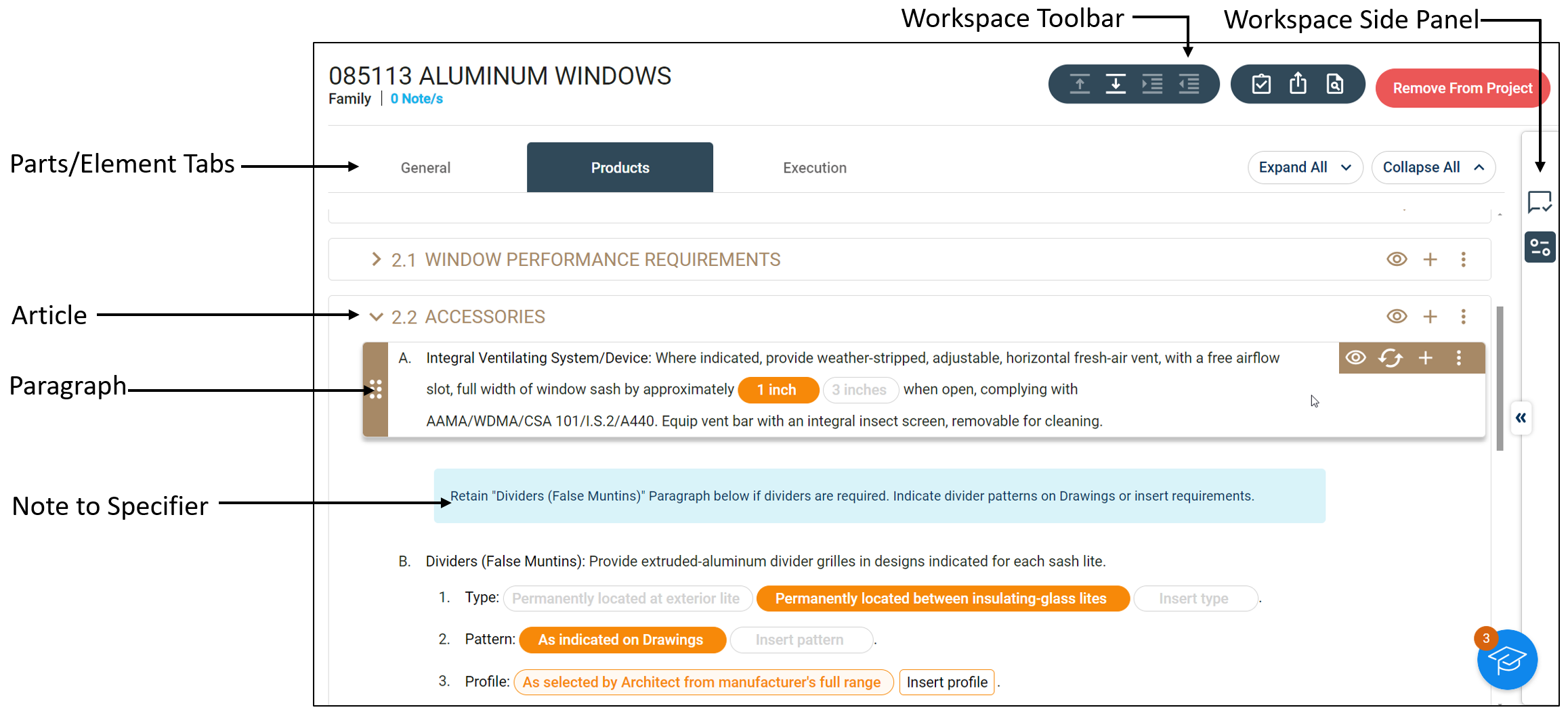 The element form displays the available content items for the selected element in the Project Elements pane. For unadded elements, use this form to review an element's contents and determine whether it fits your project requirements prior to adding it to your project specifications. For added project elements, this form functions as an editor that enables you to modify the element's available content items, such as articles, paragraphs, and performance requirements. Depending on the element type, the following content items are available: