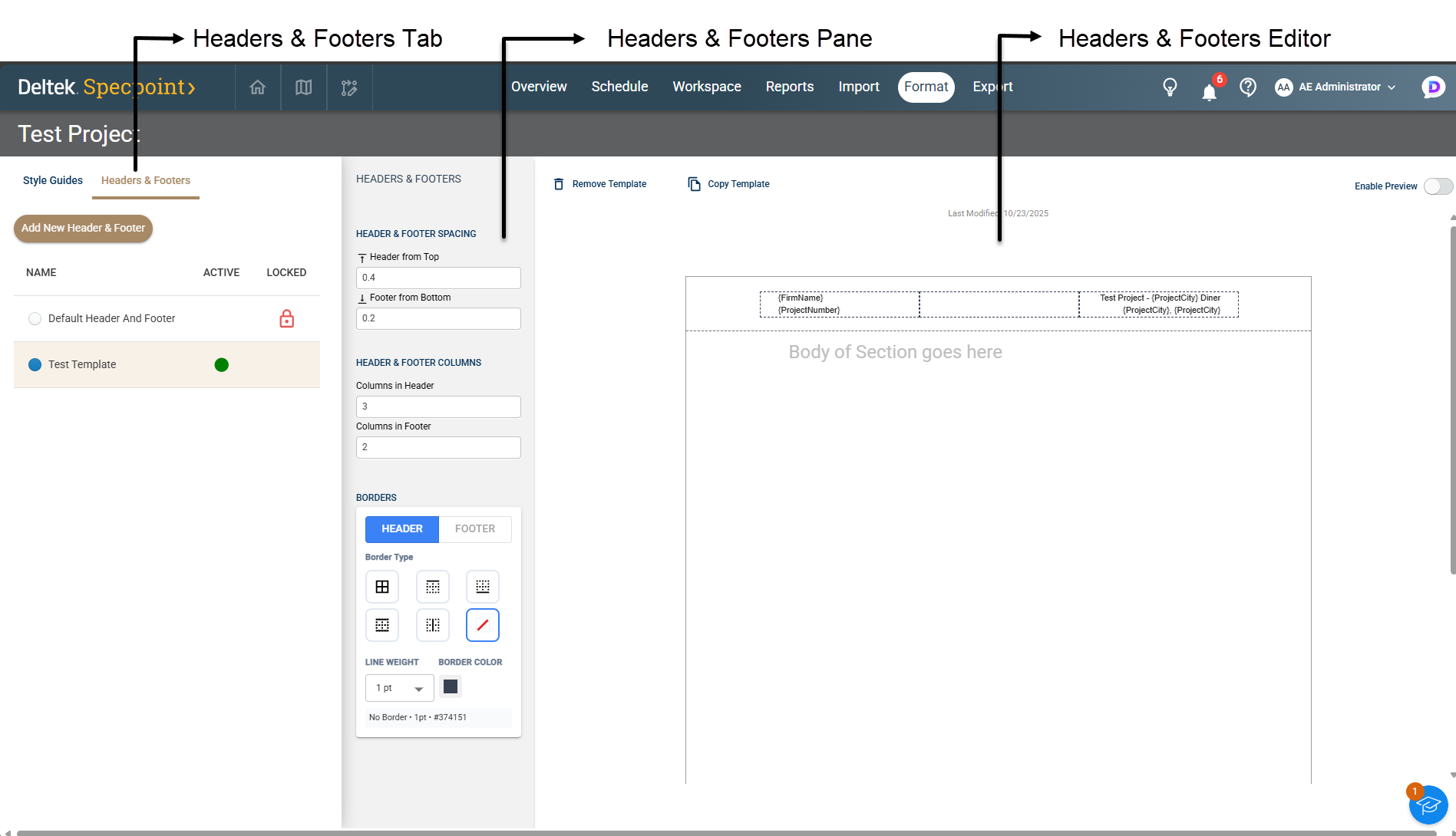 Use this tab to manage header & footer templates for your project and select templates for which to specify content and formatting settings. - Header & Footer Editor