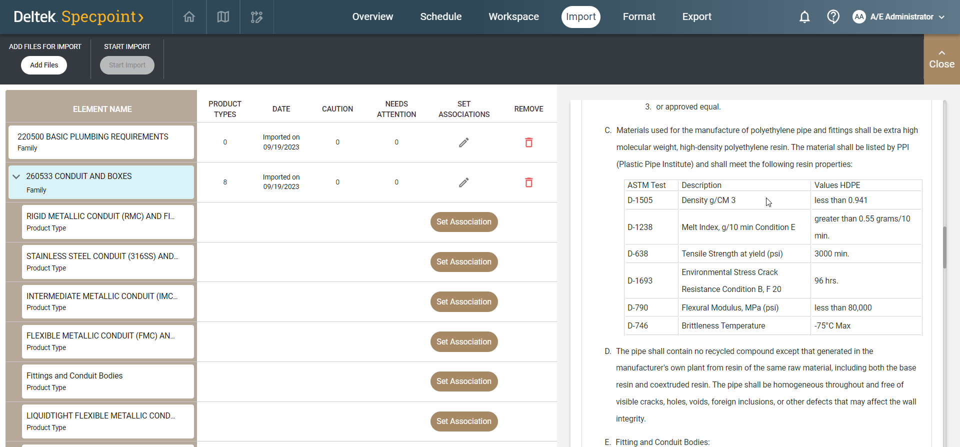• Specpoint imports content at the project level. To make external content available in multiple projects, you must upload and import them in each project.
