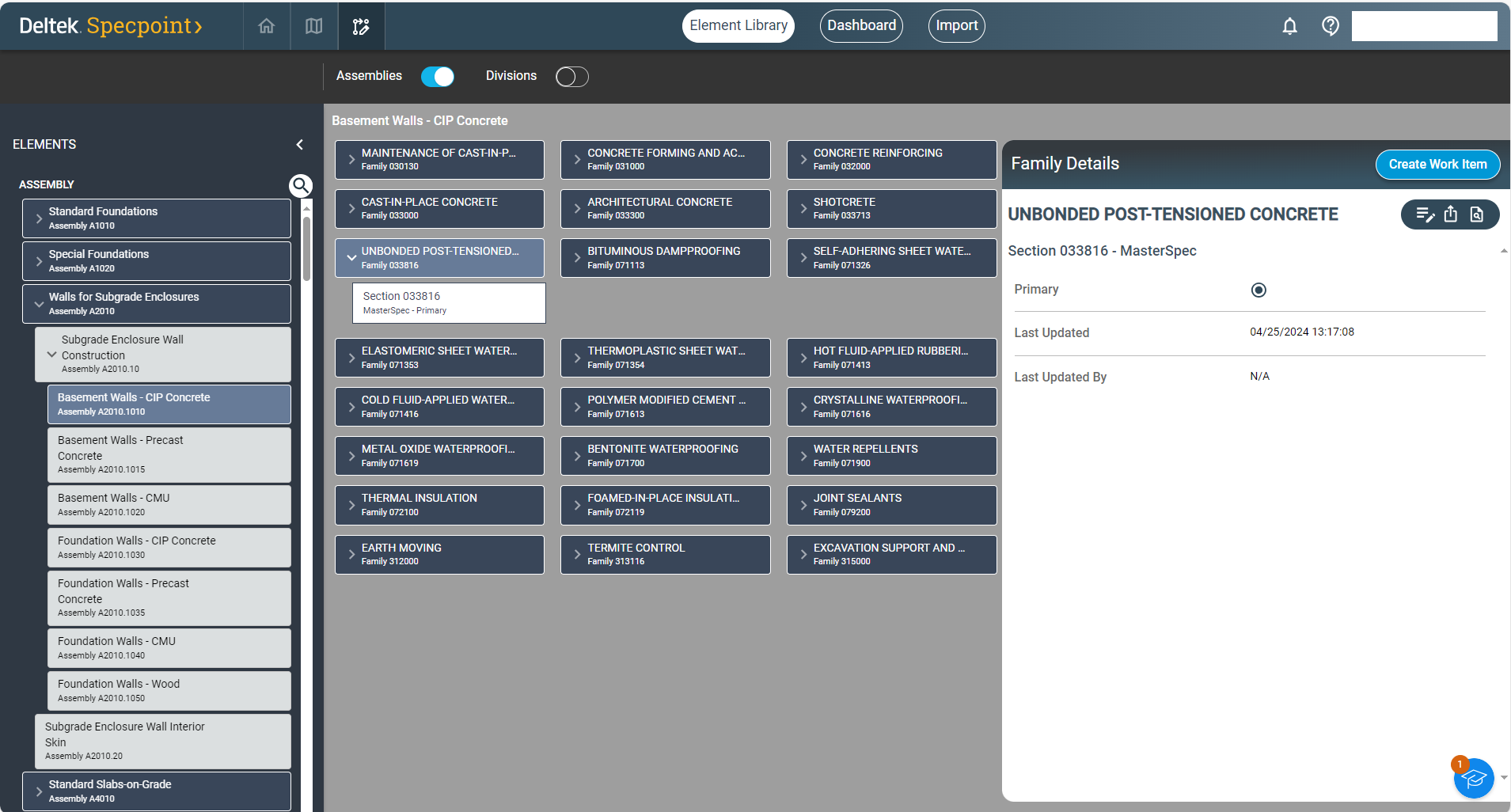 The element library enables you to work in both the Assembly/UniFormat® view and the Divisions/MasterFormat® view. Use either feature to browse through project elements based on your preferred content structure.