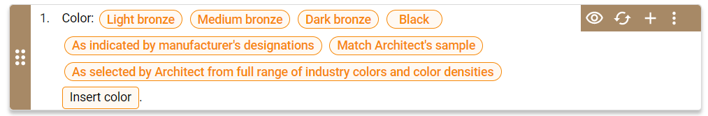 Typically, baseline paragraphs include option sets to provide authors with guided customization. This enables you to specify firm-level project requirements without deviating from baseline content and retain formatting that is readable by Specpoint's product selection.