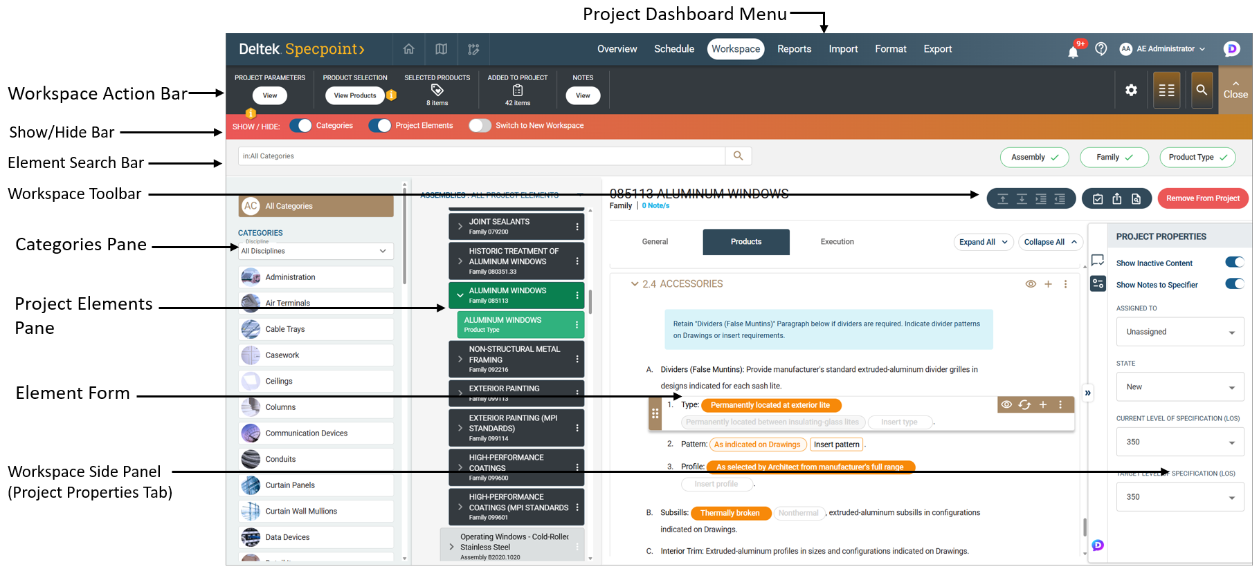 Use the project workspace, or classic workspace, to build out, organize, and edit your project specifications in a structured environment. The workspace supports adding, managing, and reviewing project elements and their content items.