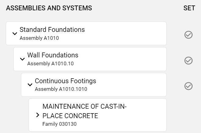 The Set Associations window displays all the available project elements in an element tree, which follows the hierarchy of project elements in the UniFormat or assembly-driven structure that Specpoint uses. This element tree is a representation of the project elements tree in the Project Elements pane.