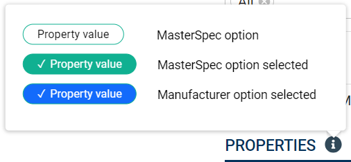 Selected This indicates that the option is selected for the product property. A selected MasterSpec option displays as a green pill with a white check. A selected manufacturer option displays as a blue pill with a white check.