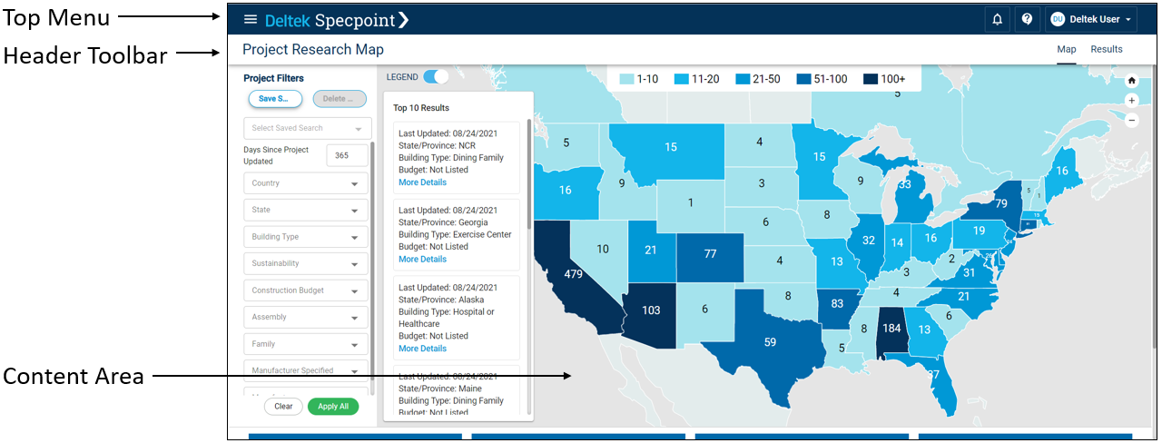 Use the navigation menu to access major areas and pages in Specpoint. - Header Toolbar