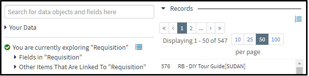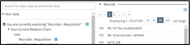 There are only 546 requisitions available in the Records pane because Data Explorer internally applies your current relation chain, using an Inner join, to show only the requisitions that have a recruiter assigned.