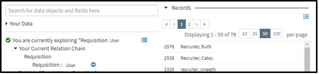 To view this from another perspective, let's click the Requisition object, expand Fields, and drill into the Recruiter details. Now if we click on the User table as the relation, we do not see the 2638 users we saw earlier, we see only 78 users. This is because there are only 78 users in Talent Management that are assigned recruiters for any requisition. Effectively, this is a list of all active recruiters.