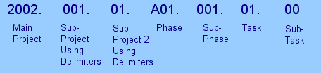 If you use project, phase, and/or task delimiters as well as phases and tasks, you can have up to six delimiters and seven segments in your WBS number. For example: