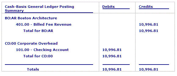 Assume that you post a cash receipt file with payments totaling $10,996.81. On the accrual side, this transaction posts as a credit to account 111.00 - A/R - Clients. For cash-basis reporting purposes, you set up revenue account 401.00 - Billed Fee Revenue and mapped this account to account 111.00.