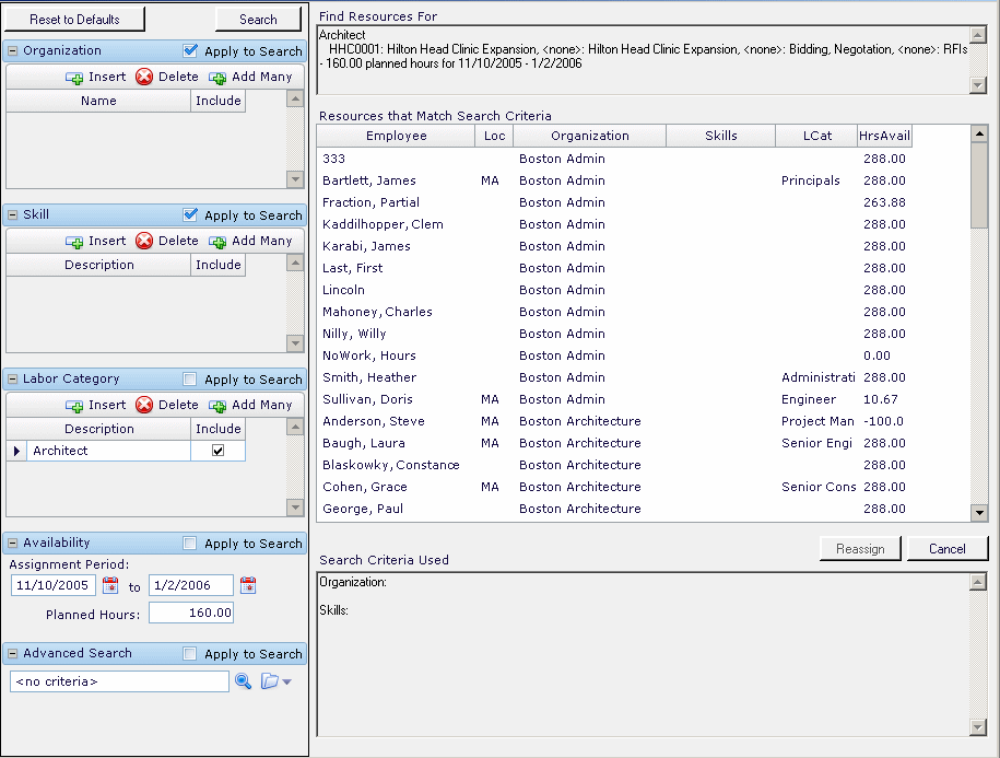 When you click on Architect in the Resource column, Vision displays the Resource drop-down. Open this drop-down and select the Resource Search option. Vision displays the Resource Search dialog box. Specify the search criteria and click Search. Vision displays a list of resources that match your search criteria.
