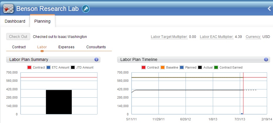 For example, following are the Labor Plan Summary and Labor Plan Timeline charts. These charts display when you select the Labor page option. As you update information on the Labor grid, the data on these charts updates accordingly to reflect the selected row.