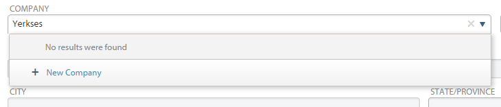 Example: While you are adding a new contact in the Contacts area, you type the contact's company name (Yerkses) in the field and find that it does not yet exist in Business Development. To add it, you click at the bottom of the selection list to display the Add Company form.