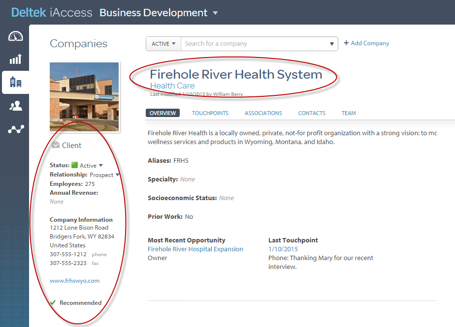 Companies area and key data (company types of roles, status, relationship to your firm, number of employees, and so on) display down the left edge.