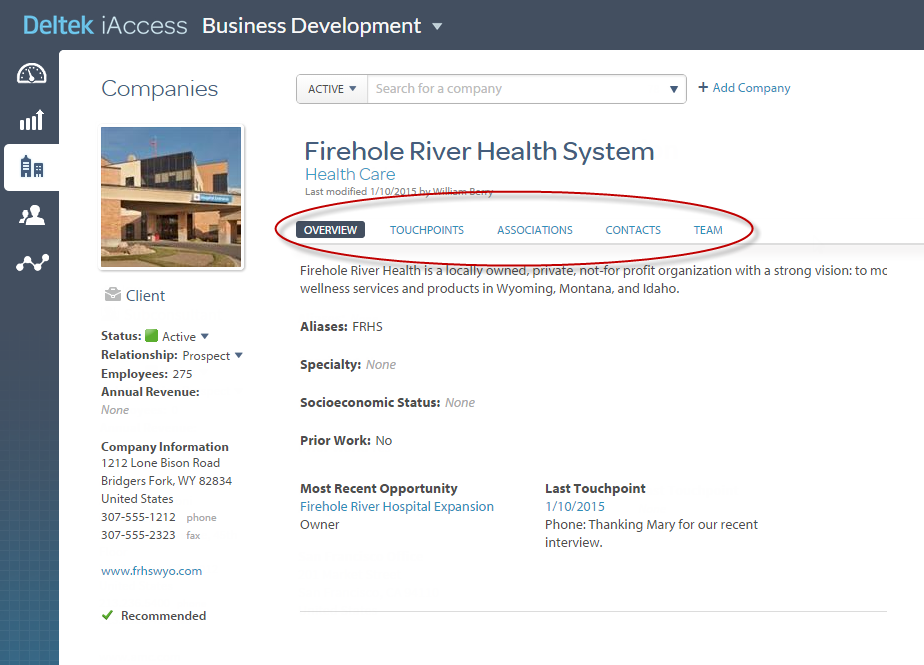 subconsultant, and so on), relationship to your firm, and primary address, is always visible. Other information displays on the Overview, Touchpoints, Associations, Contacts, and Team tabs. (Your system administrator may also add custom tabs to supplement these standard tabs.)